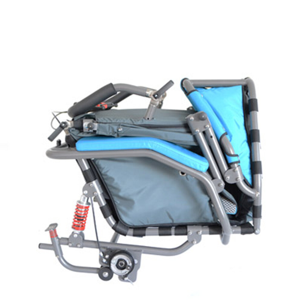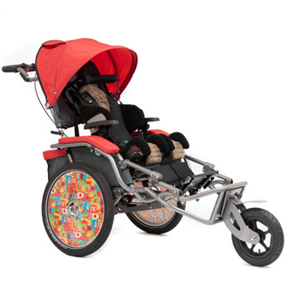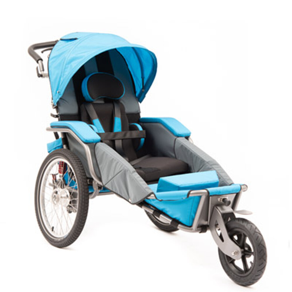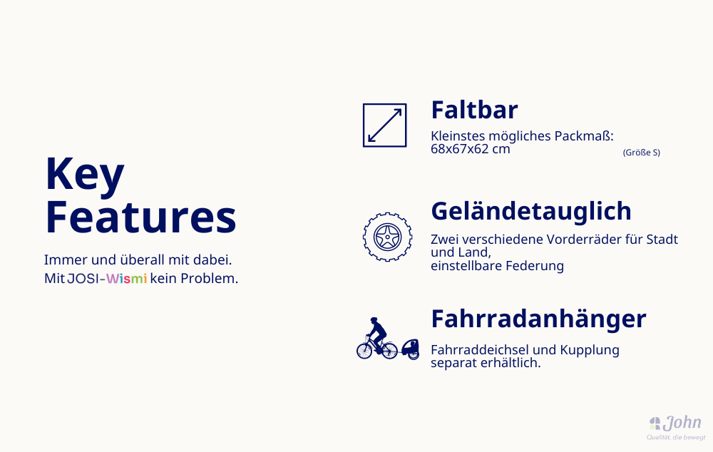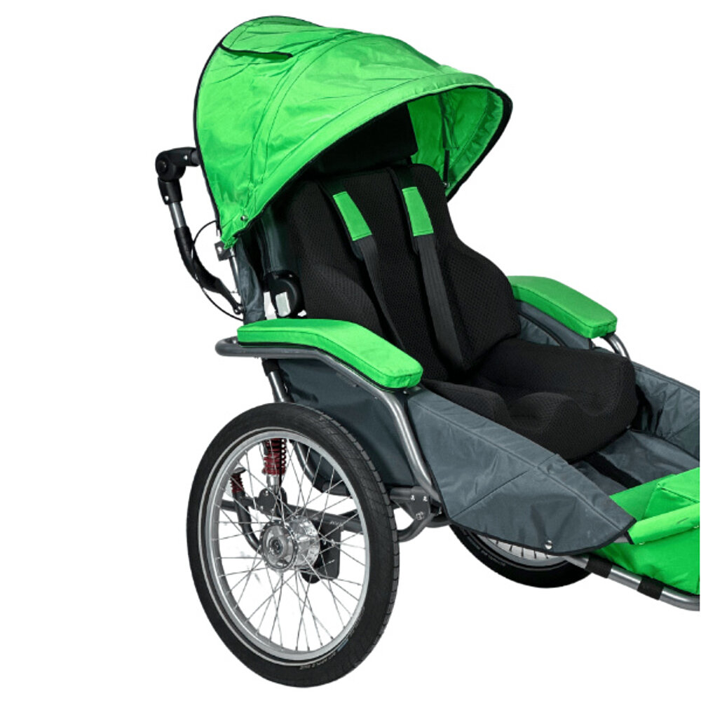 Le chariot de rééducation multifonctionnel dispose d'une roue de 20 pouces à l'arrière avec des freins à tambour pour le freinage de stationnement et de service. À l'avant, il y a soit une roue fixe tout terrain, soit une petite roue pivotante avec ou sans fonction de blocage, soit la roue Pro 12,5" réglable et blocable pour une utilisation sportive, soit un timon pour vélo. Également utilisable comme remorque de vélo, le JOSI-Wismi se plie rapidement et facilement et est un fidèle compagnon par monts et par vaux. La position assise est réglable de manière flexible et elle est disponible en trois tailles différentes (S, M & L, pour des tailles allant jusqu'à 175 cm environ) et en trois couleurs modernes. En outre, un entraînement électrique est possible et divers accessoires spécialement conçus pour le JOSI-Wismi sont disponibles.