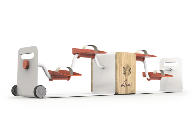 Dans sa simplicité, la Duomobil est très spéciale. Il permet à deux personnes de se mettre en mouvement ensemble : Une personne entraîne l'autre dans un mouvement rotatif en bougeant les pieds ou les mains.