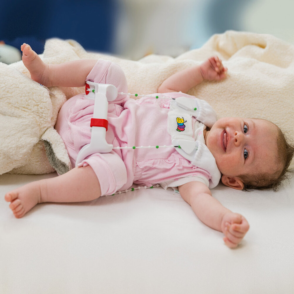 Grâce à l'attelle, les articulations des hanches de votre bébé sont pliées à un angle de plus de 90° et légèrement écartées. Même si cela vous semble inhabituel au premier abord, il s'agit simplement d'une prolongation de la phase prénatale. Les hanches de votre bébé peuvent ainsi se développer dans les mêmes conditions favorables que dans le ventre de sa mère.