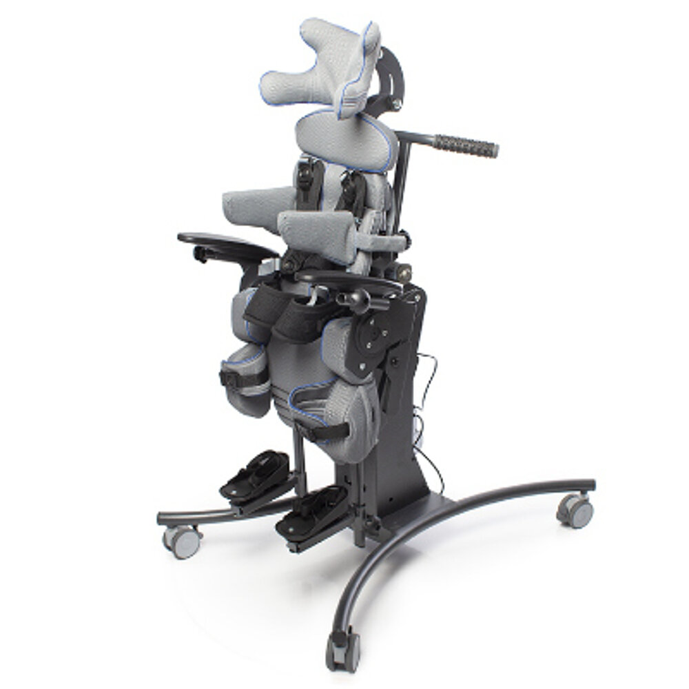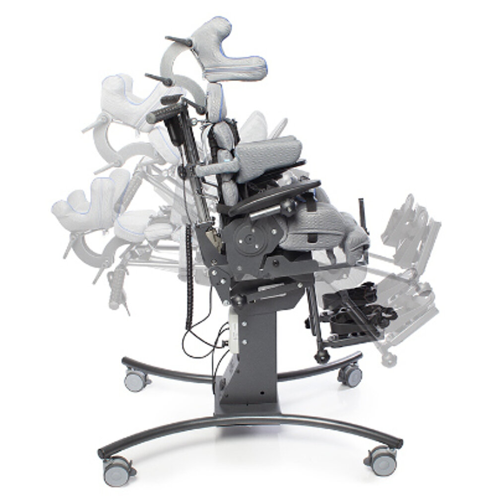 Aide à la verticalisation multifonctionnelle pour enfants et adolescents. Le transfert peut se faire en position assise, ce qui évite l'utilisation d'un élévateur. La fonction couchée ou debout souhaitée peut être réglée électriquement en continu. Le dossier "Second Spine" est anatomique.