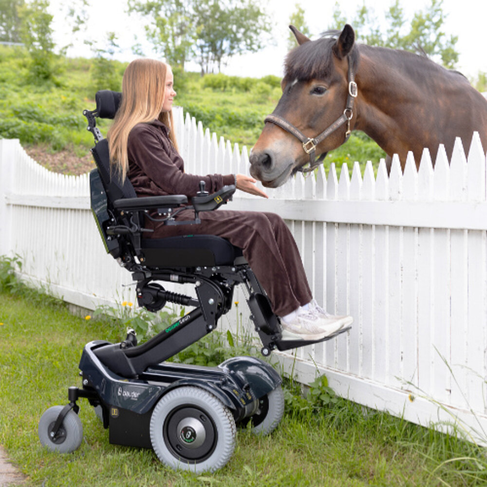 Balder Junior est un fauteuil roulant électrique qui évolue avec ton enfant et lui offre plus d'indépendance. Il offre de nombreuses positions d'assise, dont une élévation jusqu'à 80 cm et un abaissement jusqu'à 35 cm, ainsi qu'une position allongée et une inclinaison vers l'avant et l'arrière. L'assise et les repose-jambes réglables s'adaptent à la croissance. Avec 5 fonctions d'assise électriques, dont l'élévation rapide du siège et le "tilt-in-space", il facilite l'entrée et la sortie du véhicule. Une fonction "debout" est disponible en option, dont la vitesse peut être réglée à l'aide du joystick.