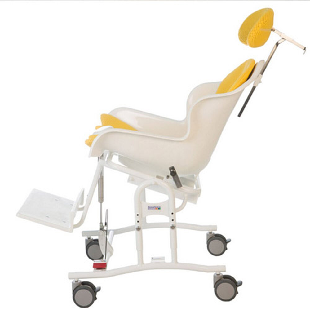 La chaise MTS (Mannheimer Dusch-Toilettensschalenstuhl) offre un soutien sûr et un grand confort d'assise. Grâce à sa forme de coque, elle favorise la position typique d'écartement des cuisses pendant l'utilisation des toilettes. Une barre de sécurité empêche le glissement vers l'avant et permet de monter une barre de bassin qui exerce une pression douce sur le bas-ventre, notamment lorsque l'utilisateur se penche en avant. Le réglage de l'inclinaison permet de créer une légère inclinaison vers l'arrière. Le MTS est un outil efficace pour l'entraînement à la propreté.