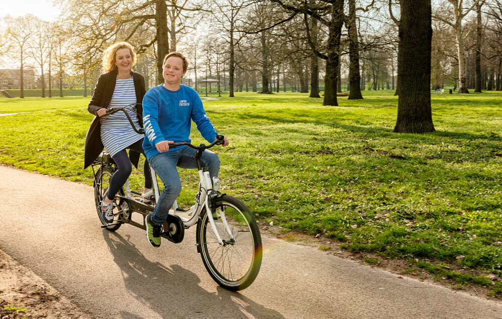 Grâce à la troisième roue, les deux cyclistes peuvent s'asseoir confortablement, même à l'arrêt. Monter et descendre du vélo est facile grâce à la grande stabilité. La partie avant peut être rabattue pour offrir plus d'espace lors de la montée et de la descente. L'accompagnateur se charge de la direction, tandis que le passager dispose d'un guidon pour se tenir. L'accompagnateur décide de la roue libre activable, qui permet au passager de pédaler. Grâce à la roue libre régulière, le passager peut choisir de pédaler ou non. Un tandem qui permet de faire du vélo ensemble sans souci de sécurité.