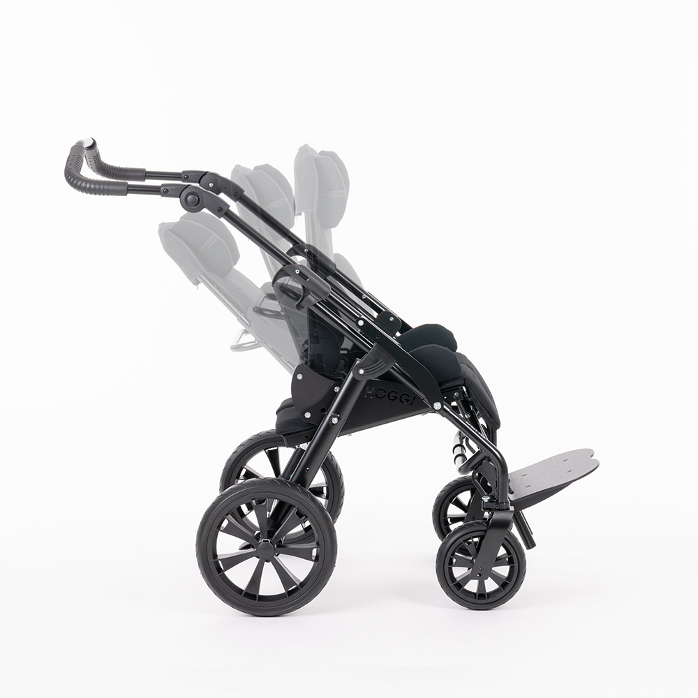 La poussette de rééducation se caractérise par sa grande stabilité et sa maniabilité grâce à son châssis compact. Elle offre une longue durée d'utilisation grâce à sa capacité de croissance qui permet une adaptation individuelle à la croissance de l'enfant. L'angle d'assise, l'angle des genoux et l'angle du dossier sont réglables afin de garantir une position assise optimale. De plus, la poussette peut être adaptée individuellement grâce aux accessoires éprouvés du BINGO Evolution afin de répondre aux besoins individuels.