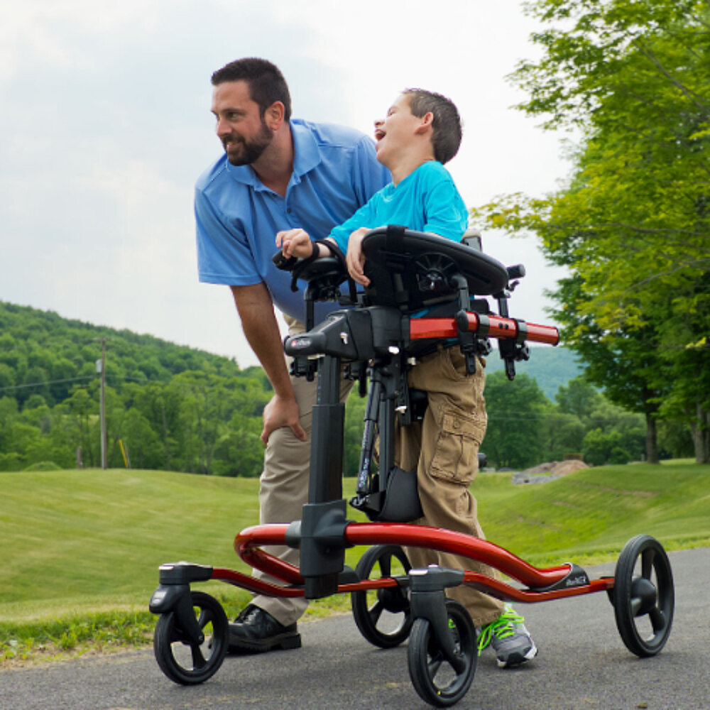 Le ressort à gaz permet de régler la hauteur de la colonne centrale et apporte un soutien lors du redressement en position debout. Le cadre supérieur dynamique offre un soutien optimal avec un mouvement vertical de 8 cm et un mouvement horizontal de 5 cm pendant la marche. Un télémètre enregistre les progrès de la thérapie, tandis que des fixations directionnelles aident à marcher en ligne droite. Le support de tronc multifonctionnel peut être ajusté en profondeur, en hauteur et en angle. Le cadre supérieur dans les tailles 2+3 peut être retiré du châssis standard et monté sur le châssis combiné ou du tapis roulant pour offrir plus de diversité. Les roulettes avec frein de ponçage, arrêt de retour, frein de blocage et blocage directionnel garantissent une mobilité et une sécurité accrues. La construction légère et stable garantit une démarche optimisée, tandis que les supports rembourrés de l'avant-bras supportent une partie du poids du corps. La selle multi-positionnement s'adapte rapidement à la position du bassin.