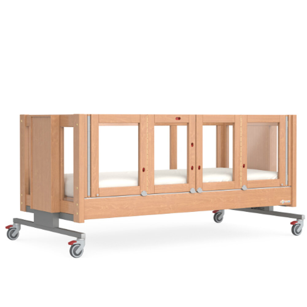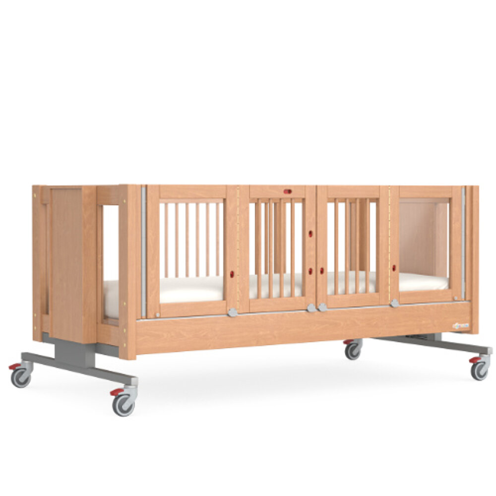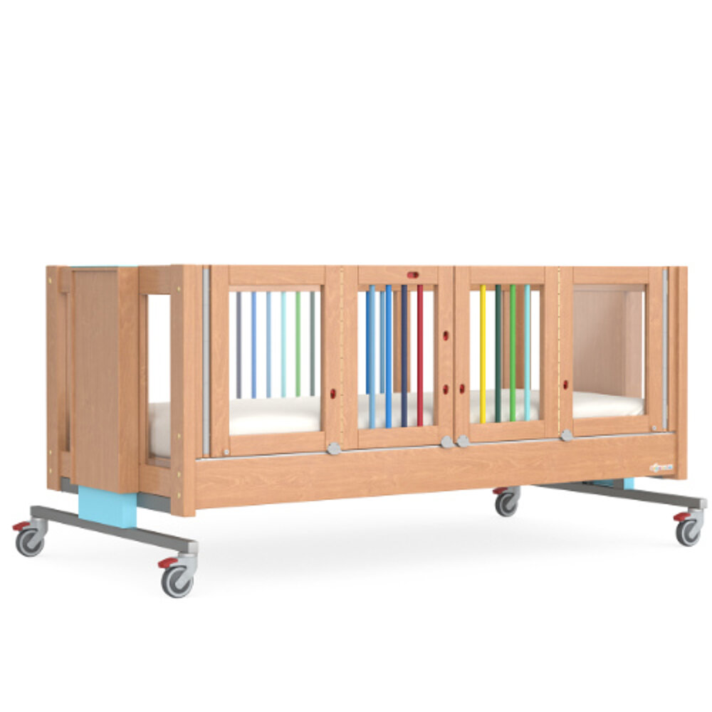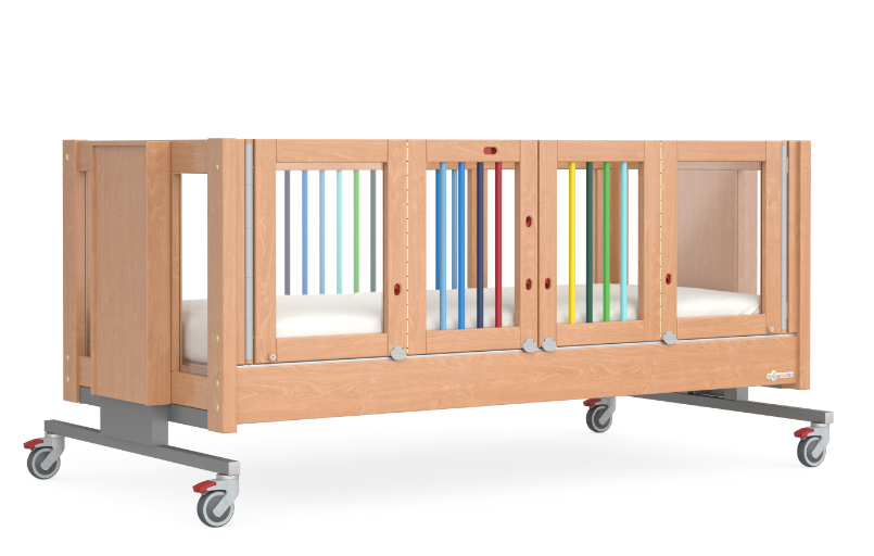 Le lit KayserBett EMMA 1 convient aux enfants et aux adolescents souffrant de divers handicaps et offre, grâce à une hauteur d'accès de 66 cm, des possibilités de soins optimales pour les personnes en fauteuil roulant. Grâce à l'équipement partiel en verre acrylique, les enfants peuvent participer activement aux événements environnementaux. Le lit KayserBett EMMA 1 est équipé de portes de 60 cm de haut, au choix sur un ou deux côtés. Ainsi, les enfants agités sur le plan moteur sont protégés contre une entrée et une sortie sans surveillance. Une ferrure de porte spéciale empêche l'ouverture des portes de l'intérieur. Grâce au réglage en hauteur de 45 cm à 105 cm (bord supérieur du matelas), le lit KayserBett EMMA 1 est idéal pour les soins et la thérapie, tout en restant ergonomique. Le KayserBett EMMA 1 peut être placé sous le lit, ce qui permet d'utiliser des lève-personnes.