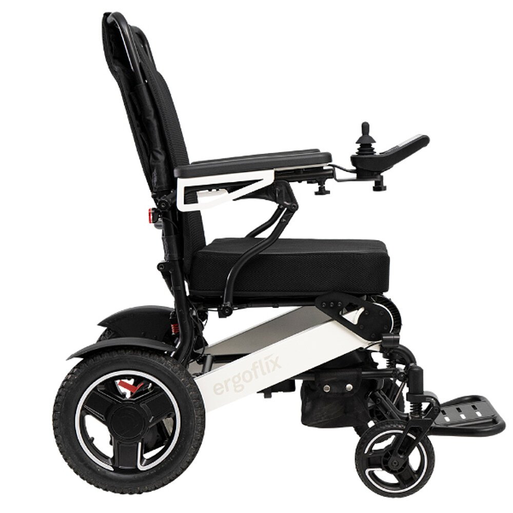 L'ergoflix® LX est un fauteuil roulant électrique pliable qui convainc aussi bien à l'intérieur qu'à l'extérieur. De grandes roues arrière de 12,5 pouces et une assise de 48 cm de large garantissent un confort de conduite maximal. Un dossier réglable en hauteur, de larges accoudoirs rembourrés ainsi qu'un dossier de forme ergonomique favorisent une position assise saine. Le modèle se plie de manière compacte en un tour de main et se transporte facilement. Le fauteuil roulant électrique est disponible en rouge et en blanc. Bon à savoir : L'ergoflix® LX est éligible à une subvention de la caisse de maladie.