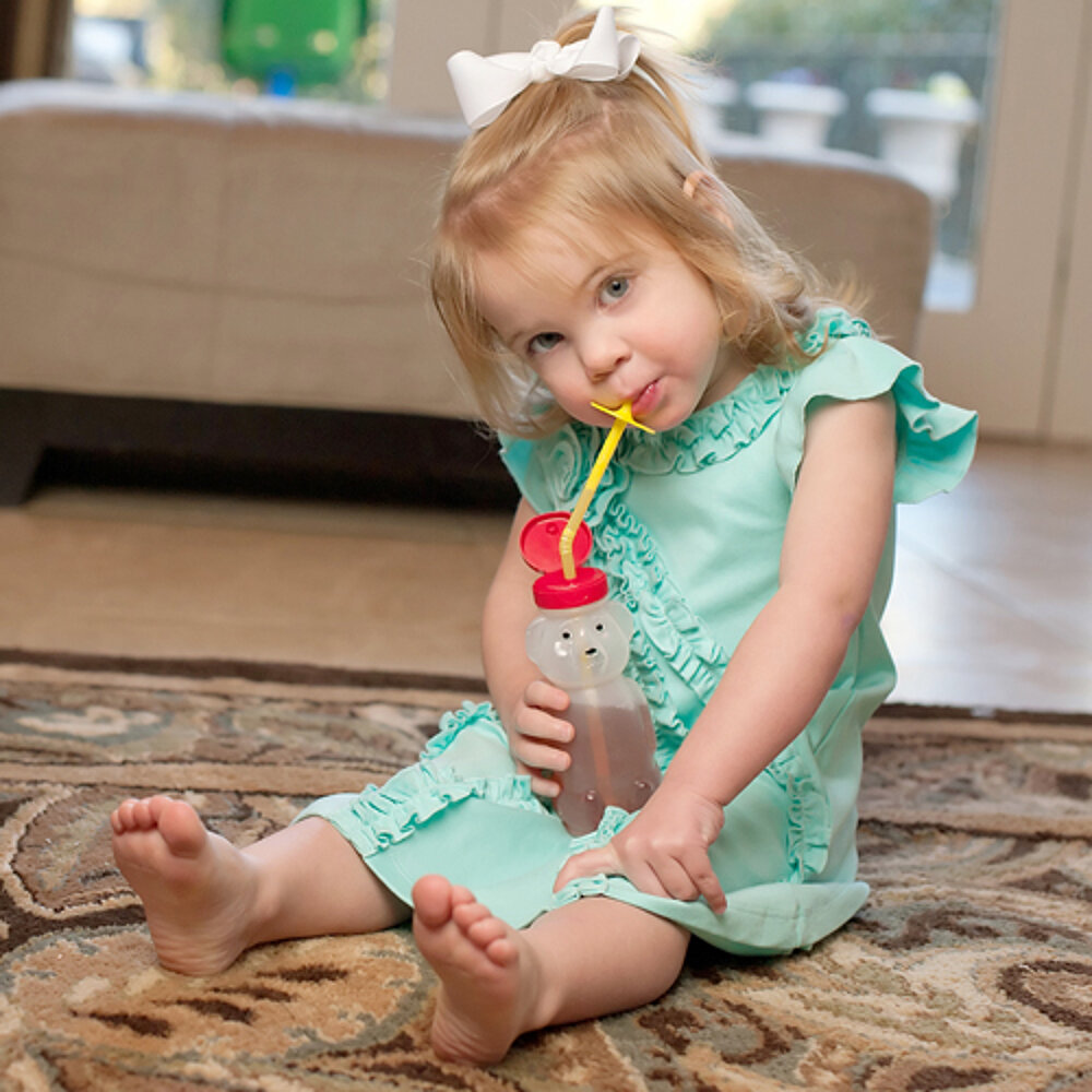 Doch Felix hat es schnell verstanden, wie er etwas aus dem Bären raus bekommt. Durch seinen schlechten Mundschluss läuft zwar immer noch etwas nebenher, aber die Babyflasche ist schon mal vom Esstisch weg.