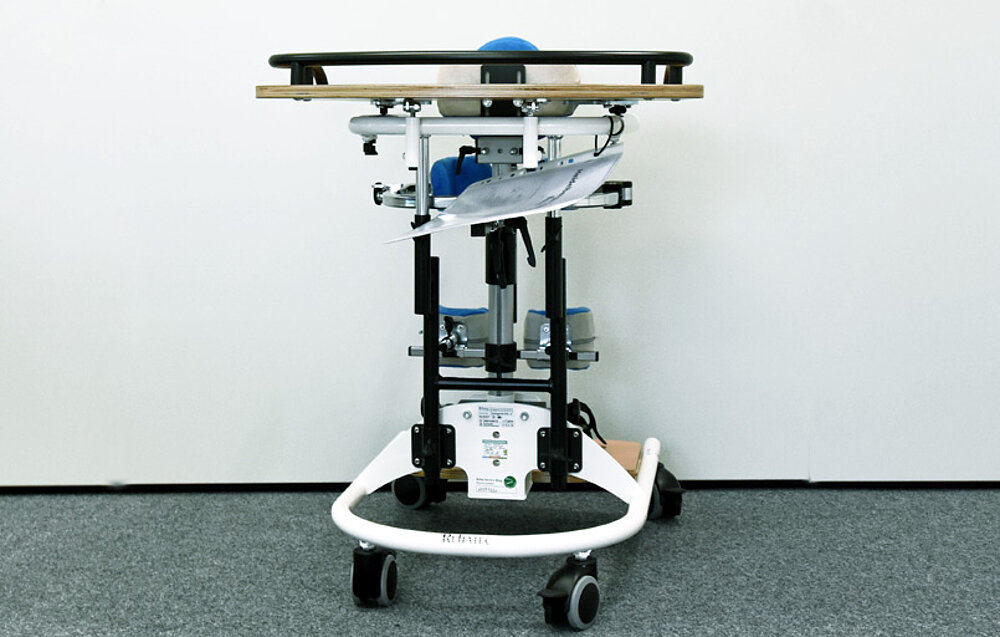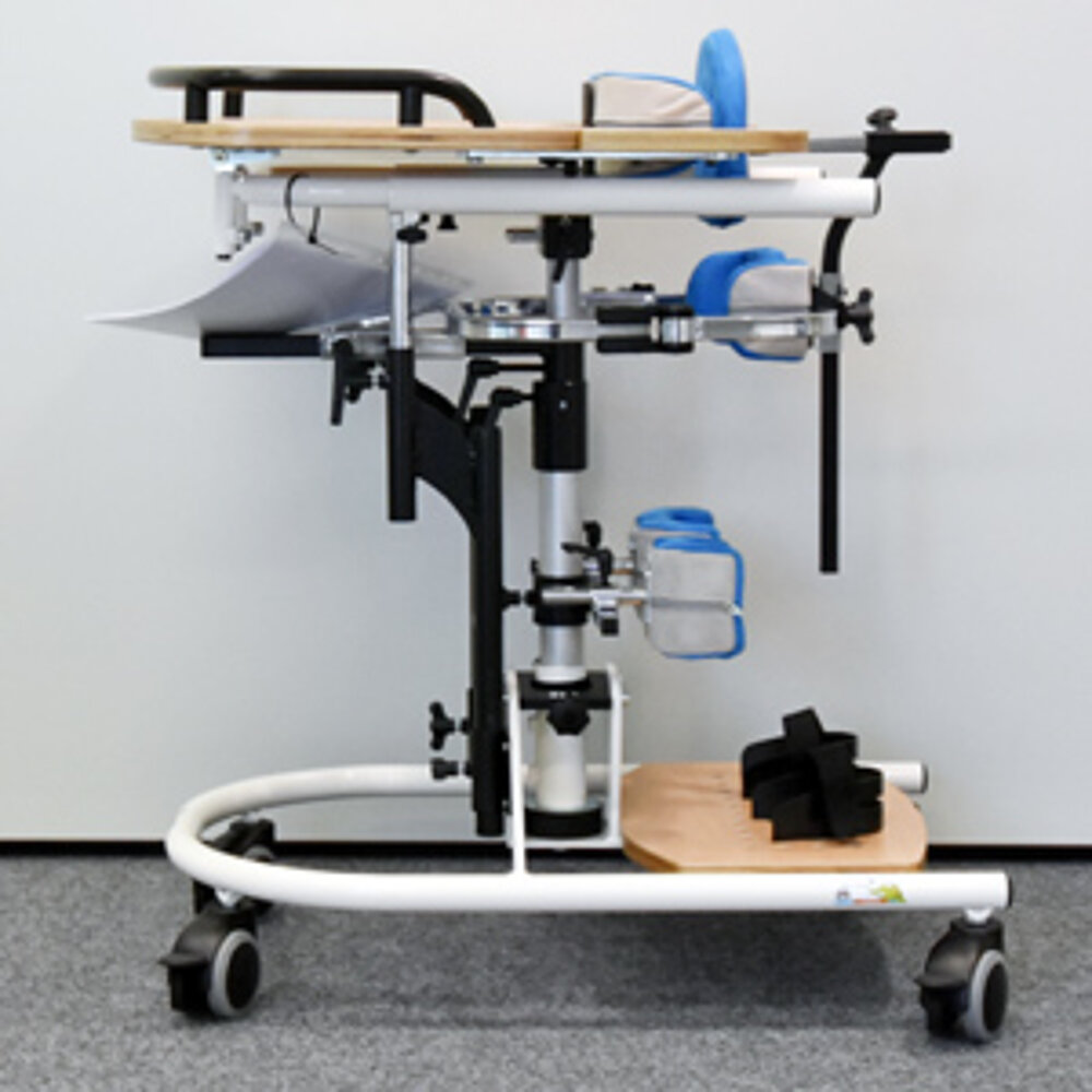Das Stehgerät ist sehr stabil und einfach zu bedienen. Gut geeignet für ein Kind das weniger Unterstützungsfläche benötigt( nur schwache dyskinetischen Komponente, keine oder kaum Kontrakturen der UEx) und etwas beim Einsteigen helfen kann. Die Kniegelenke sollte das Kind stabilisieren können, sodass keine ständige Überstreckung passiert.