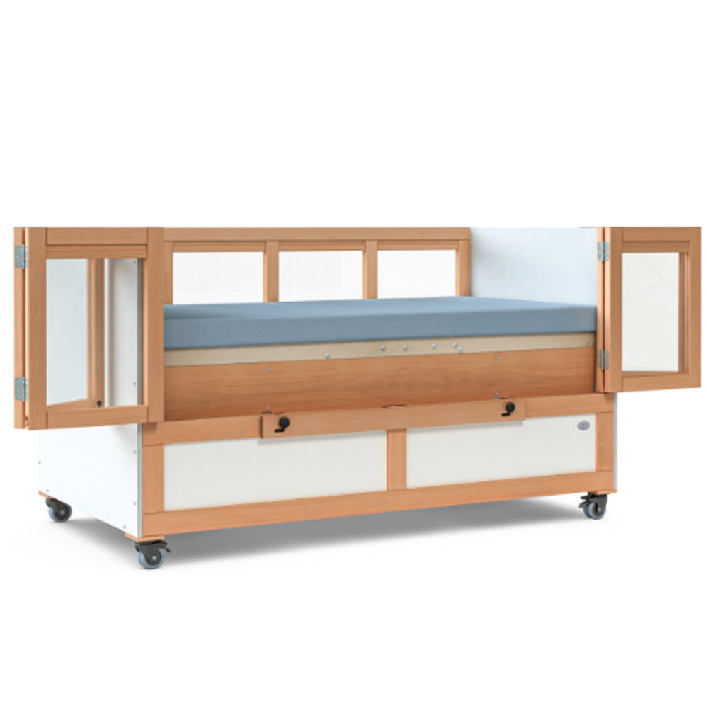 Le lit économique de la série LEON offre une solution de soins simple et allie sécurité et technique : avec son réglage en hauteur électromotorisé, sa solide protection d'intervention et ses portes en deux parties faciles à manipuler, le lit LEON répond à toutes les exigences. Disponible dans les hauteurs de porte 68 cm et 102 cm.