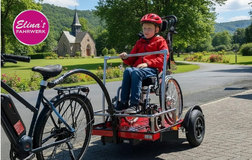 Bisher fährt unser Zugfahrzeug noch allein mit Mamas Muskelkraft, wobei da langsam eine Grenze erreicht wird und wir demnächst ein E-Bike ergänzen werden (Anhänger, Rollstuhl und Kind bringen es zusammen auf ca. 70kg, was bergauf für strammes Training sorgt).
