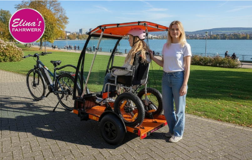Bisher fährt unser Zugfahrzeug noch allein mit Mamas Muskelkraft, wobei da langsam eine Grenze erreicht wird und wir demnächst ein E-Bike ergänzen werden (Anhänger, Rollstuhl und Kind bringen es zusammen auf ca. 70kg, was bergauf für strammes Training sorgt).