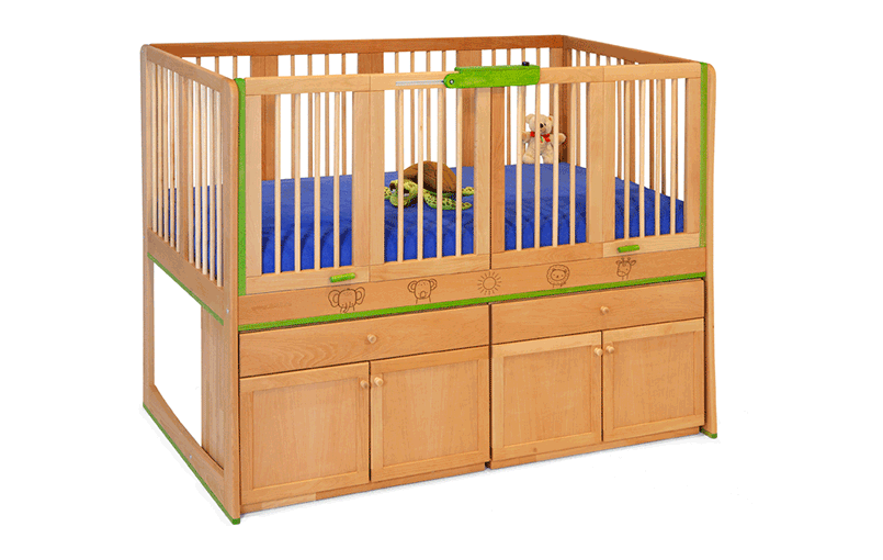 Avec une surface en bois adaptée aux enfants (DIN 71-3), une protection contre l'humidité et des couleurs personnalisées, Lola est polyvalente - pour dormir, jouer, soigner et faire de la thérapie.