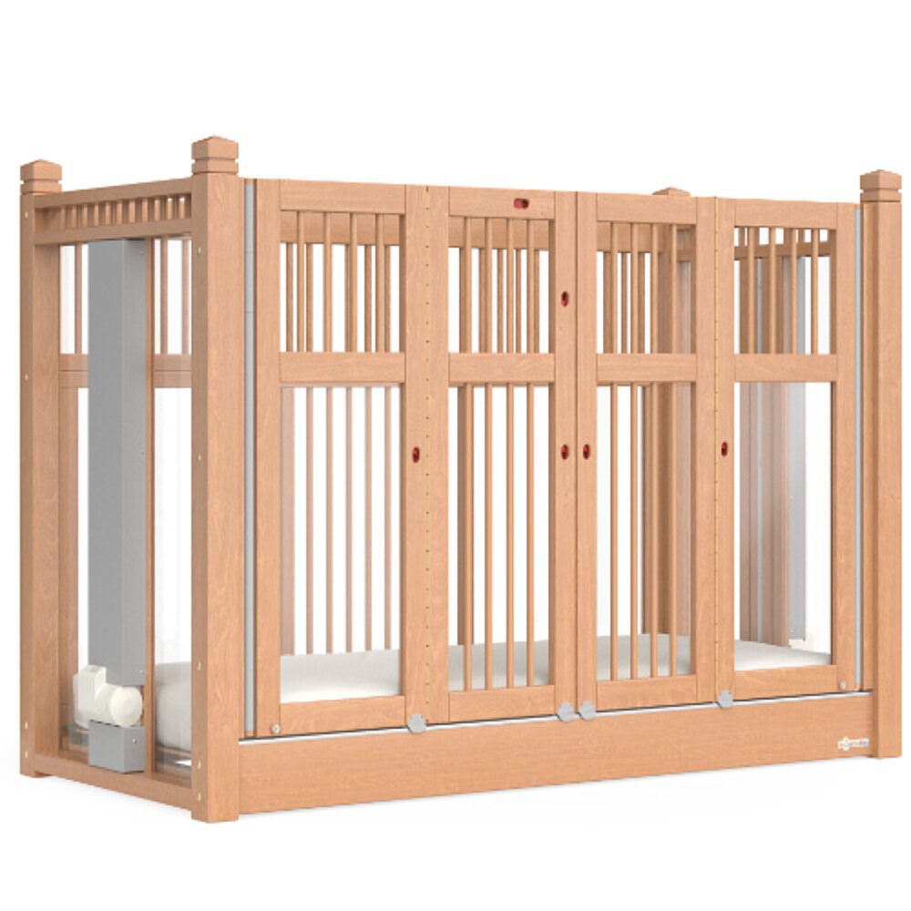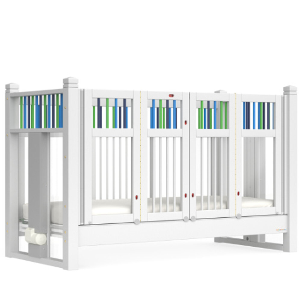 Uns war damals wichtig ein Bett zu haben, welches nicht zu sehr nach Krankenhaus aussieht und das tut es nicht. Wir haben die naturfarbene Variante mit weißen Aufsätzen.