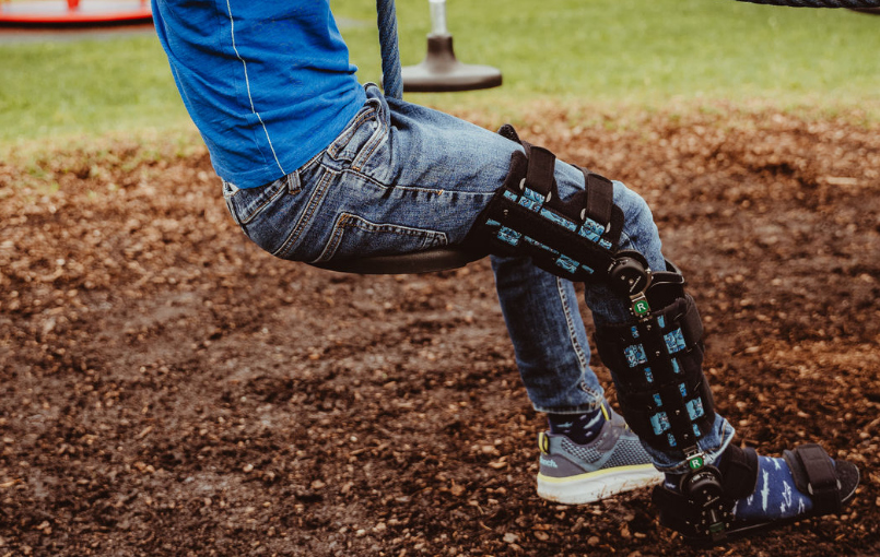 Orthèse de jambe entière pour la redression dynamique et le maintien en position debout avec fonction de blocage dans l'articulation du genou.