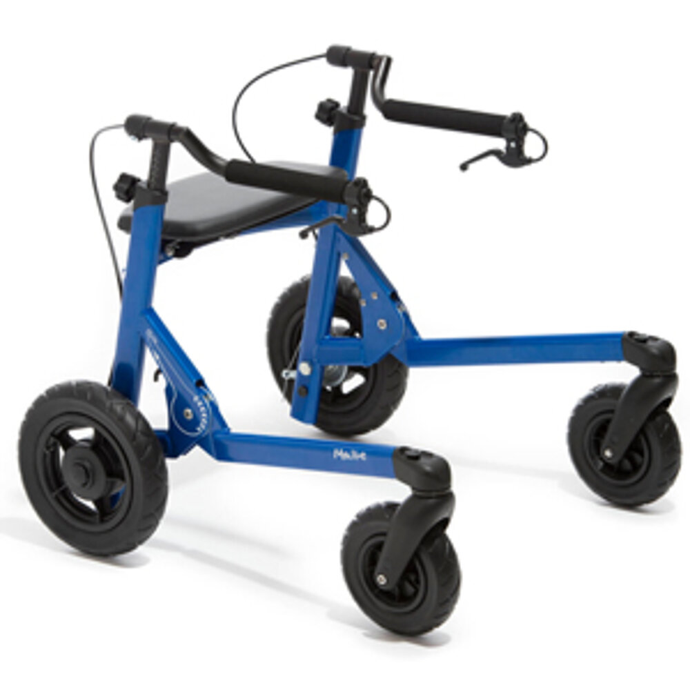 Le trotteur est disponible en cinq tailles différentes. Le cadre en abduction soutient la marche et empêche le balancement vers l'extérieur. Grâce au dispositif de blocage de la direction, il est possible de marcher en ligne droite. Le cadre en aluminium peut être facilement replié grâce à des articulations pliantes. Une butée de retour permet d'éviter que le trotteur ne recule involontairement. Les supports de l'avant-bras sont équipés de poignées. La banquette rembourrée peut être facilement rabattue vers l'arrière. Les roues pivotantes EVA très maniables permettent de manœuvrer le trotteur sans effort. Le repose-fesses peut être transformé en dossier en un tour de main.