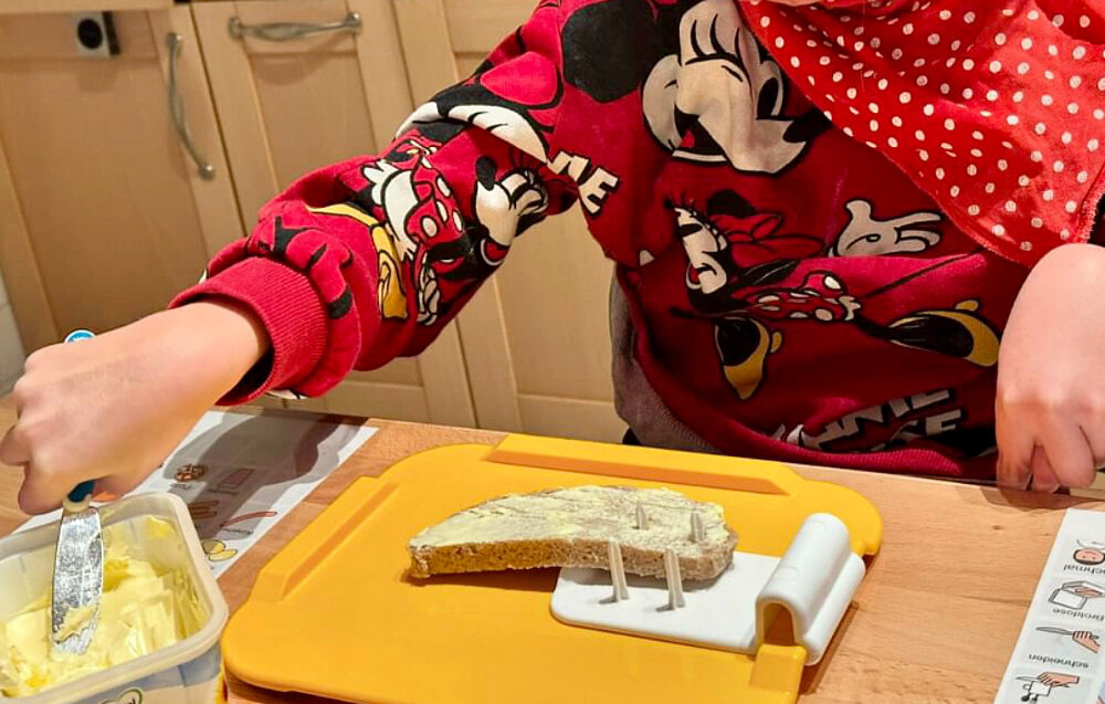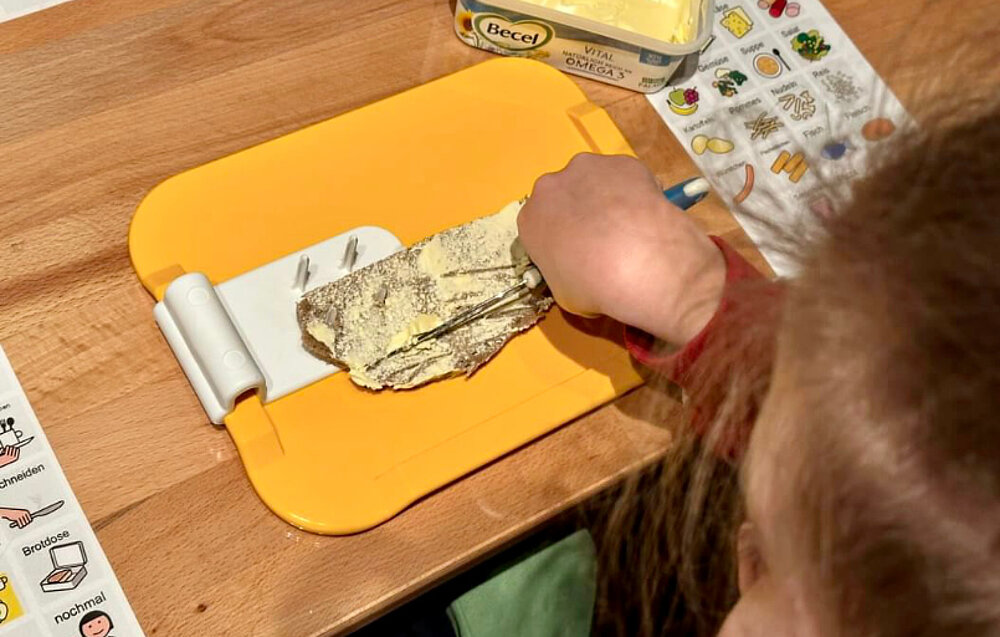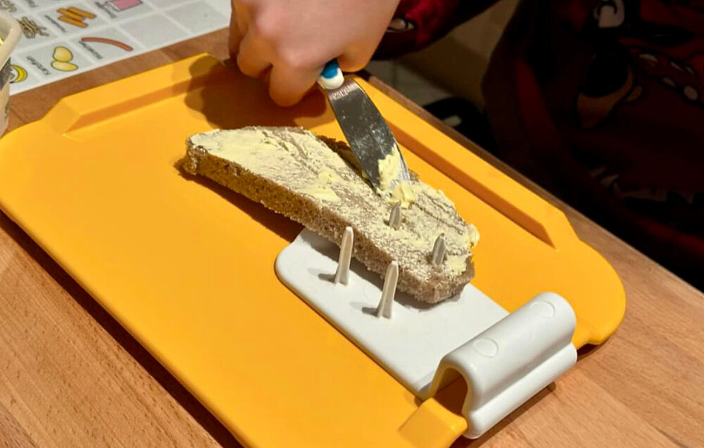 Ce produit permet de tartiner du pain de manière autonome d'une seule main : le bord surélevé sur trois côtés empêche la tranche de pain de glisser, tandis que l'anneau antidérapant au fond assure une bonne stabilité. L'aide à la préparation peut également être utilisée pour fixer les petits pains, les fruits et les légumes et permet ainsi de préparer les aliments d'une seule main.