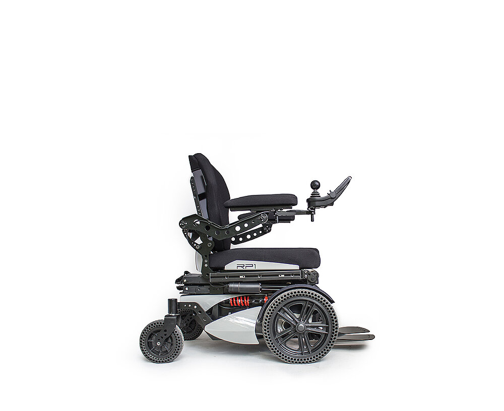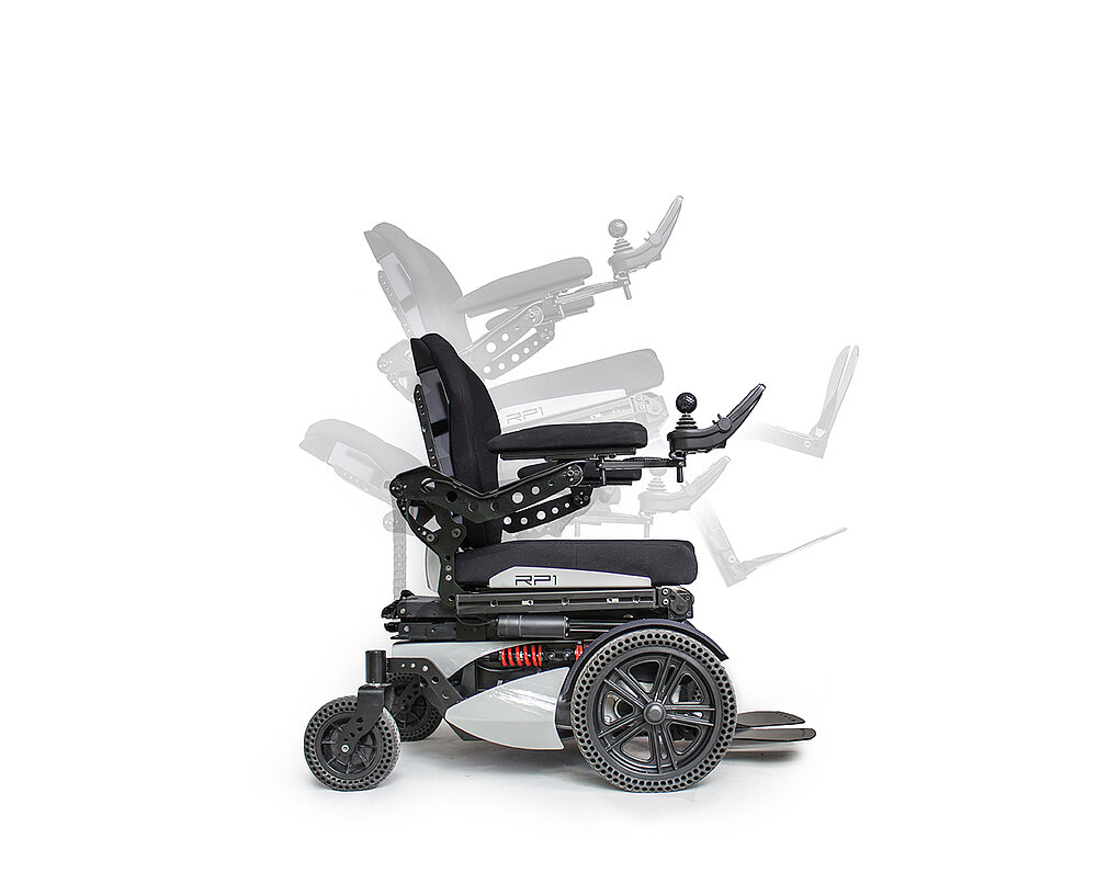Le fauteuil roulant électrique RP1 est équipé d'un siège élévateur électrique. D'autres fonctions électriques sont disponibles en option moyennant un supplément.