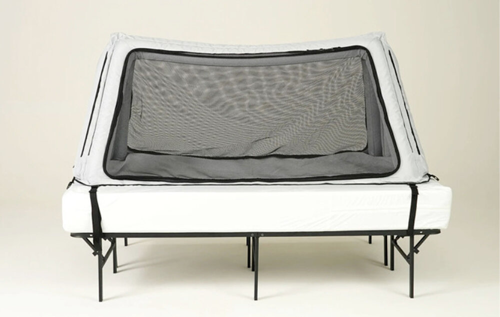 Das @safeplacebedseu ist eine Art Zelt mit dreieckigem "Dach" die Seitenwände stellen sich durch Aufblasen der Gummischläuche stabil auf.