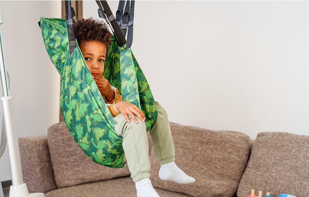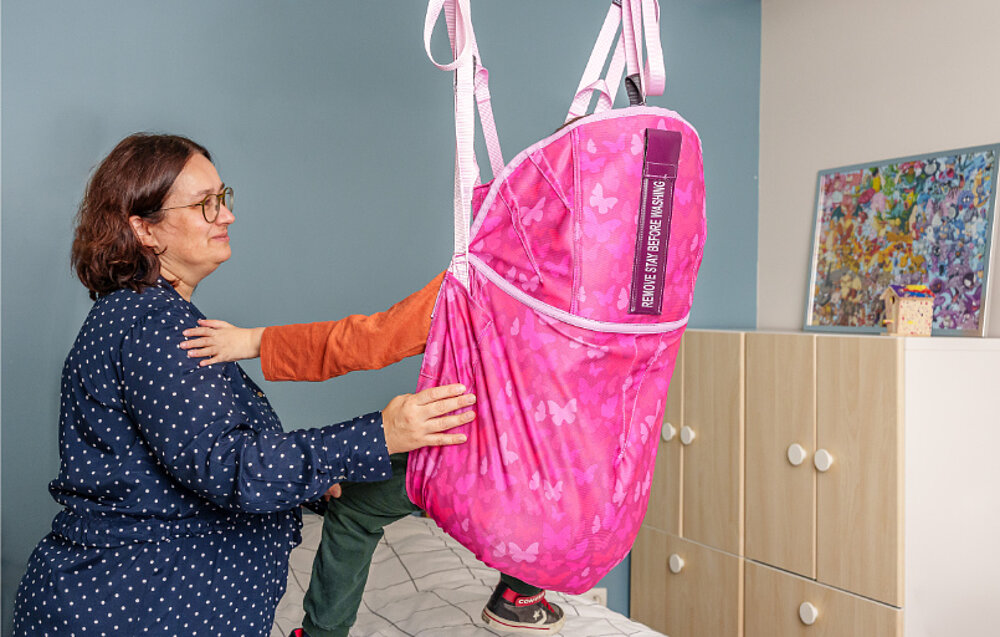 Facile à mettre en place, la sangle offre un soutien complet et sûr à votre enfant. Elle est très confortable. Les sangles pour enfants peuvent être utilisées en combinaison avec tous les systèmes de levage et les dispositifs d'accrochage de Handi-Move. La sangle pour enfants, fabriquée dans un matériau robuste et durable (polyester), peut être lavée en machine et séchée au sèche-linge, comme la plupart des sangles Handi-Move.