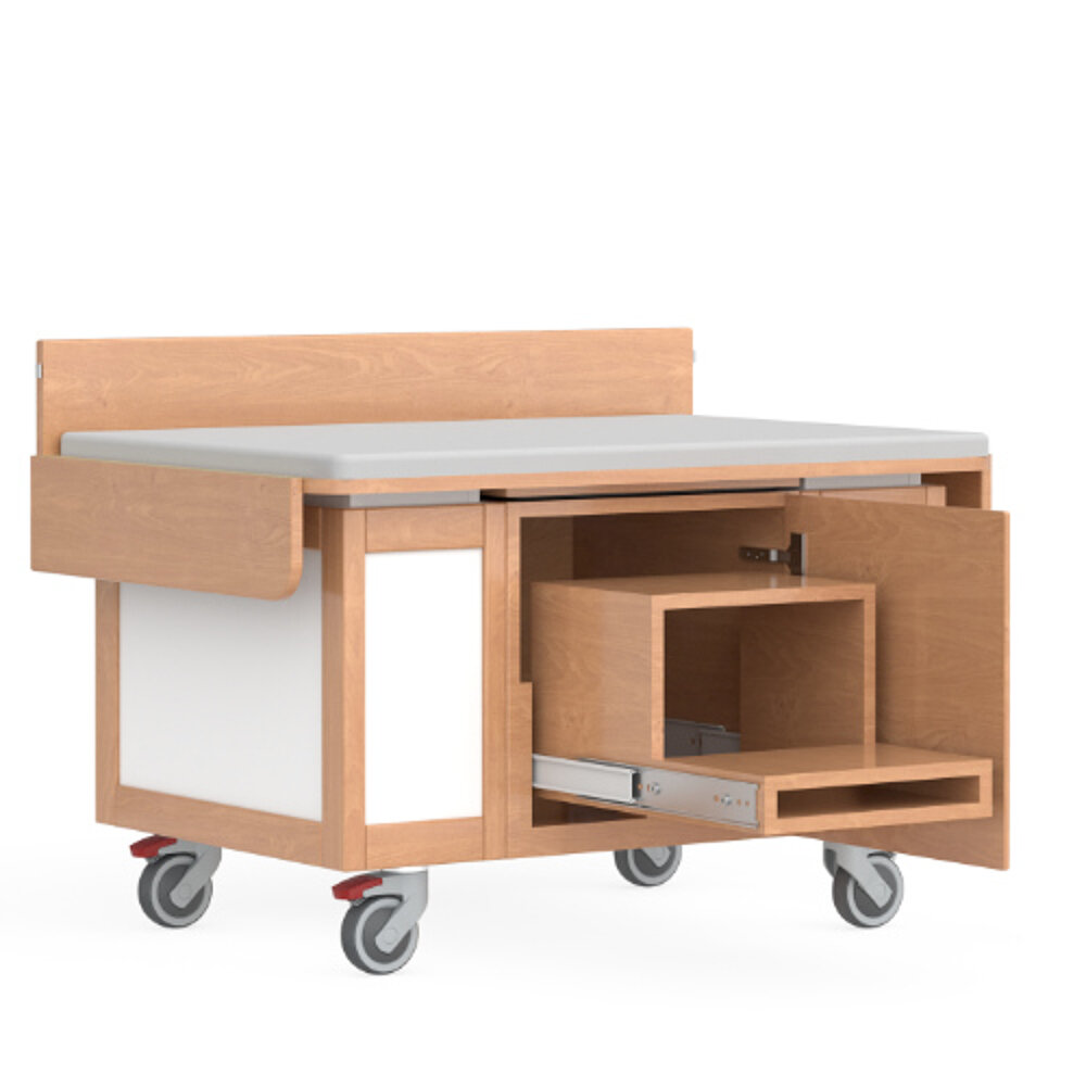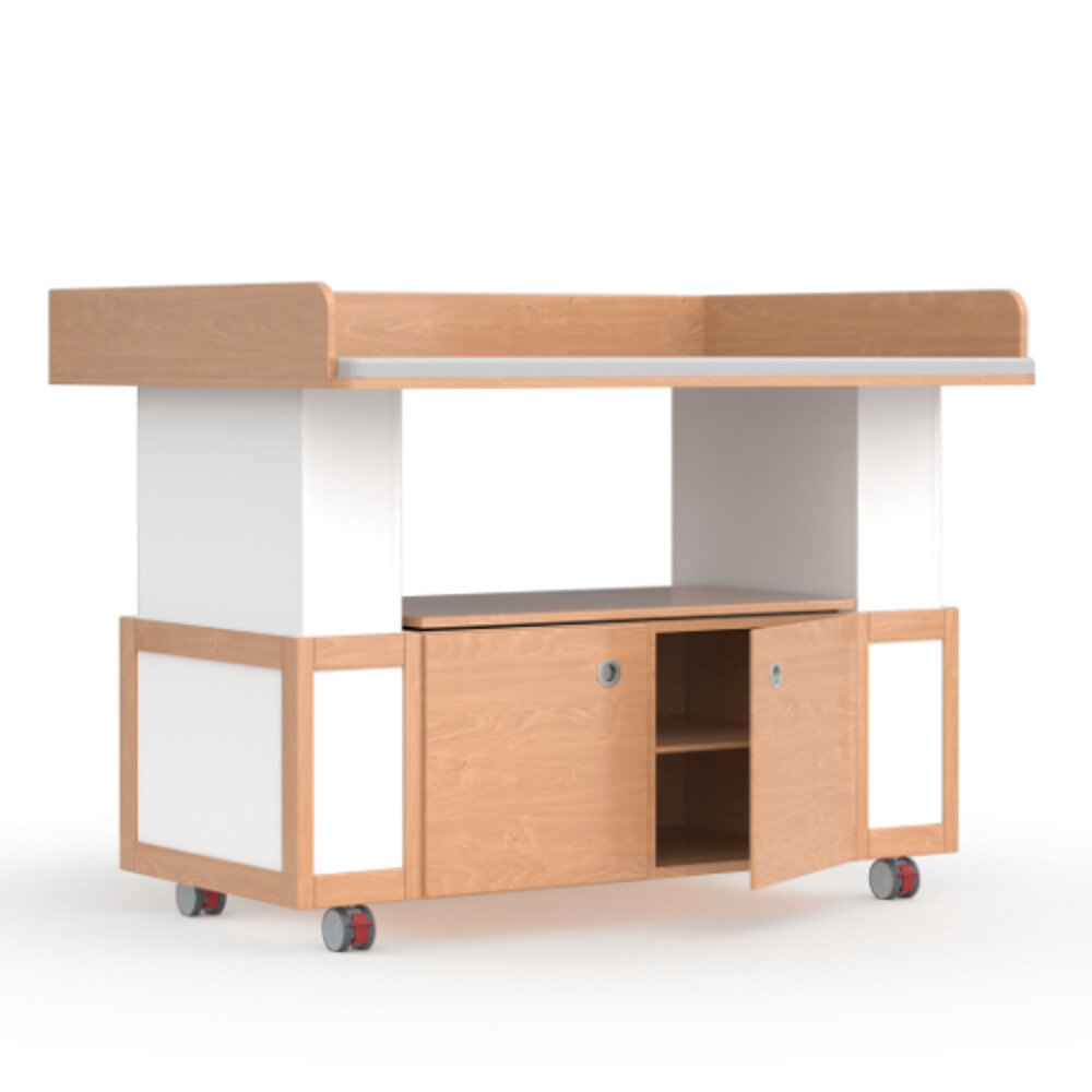 Nos tables à langer sont toujours réglables en hauteur de 40 cm et sont utilisées aussi bien à la maison que dans les institutions telles que les jardins d'enfants, les écoles ou les centres de soins de jour. Le réglage de la hauteur permet de travailler en ménageant son dos. Grâce à un capteur d'arrêt intégré, il n'y a aucun risque de coincemententre le plan à langer et le corps de la table . Vous pouvez choisir la table à langer avec rebord, qui peut être rembourré au choix. Des roulettes à frein permettent de déplacer la table à langer pour assurer la propreté en dessous de celle-ci. Celui qui change et soigne a bien sûr aussi besoin de place pour les couches, les serviettes et autres ustensiles. Ceux-ci peuvent être rangés en dessous de la surface à langer. Que ce soit des armoires ou des tiroirs, nous construisons ce que vous souhaitez. Un surmatelas est bien entendu inclus - choisissez la couleur qui convient à votre concept d'espace.