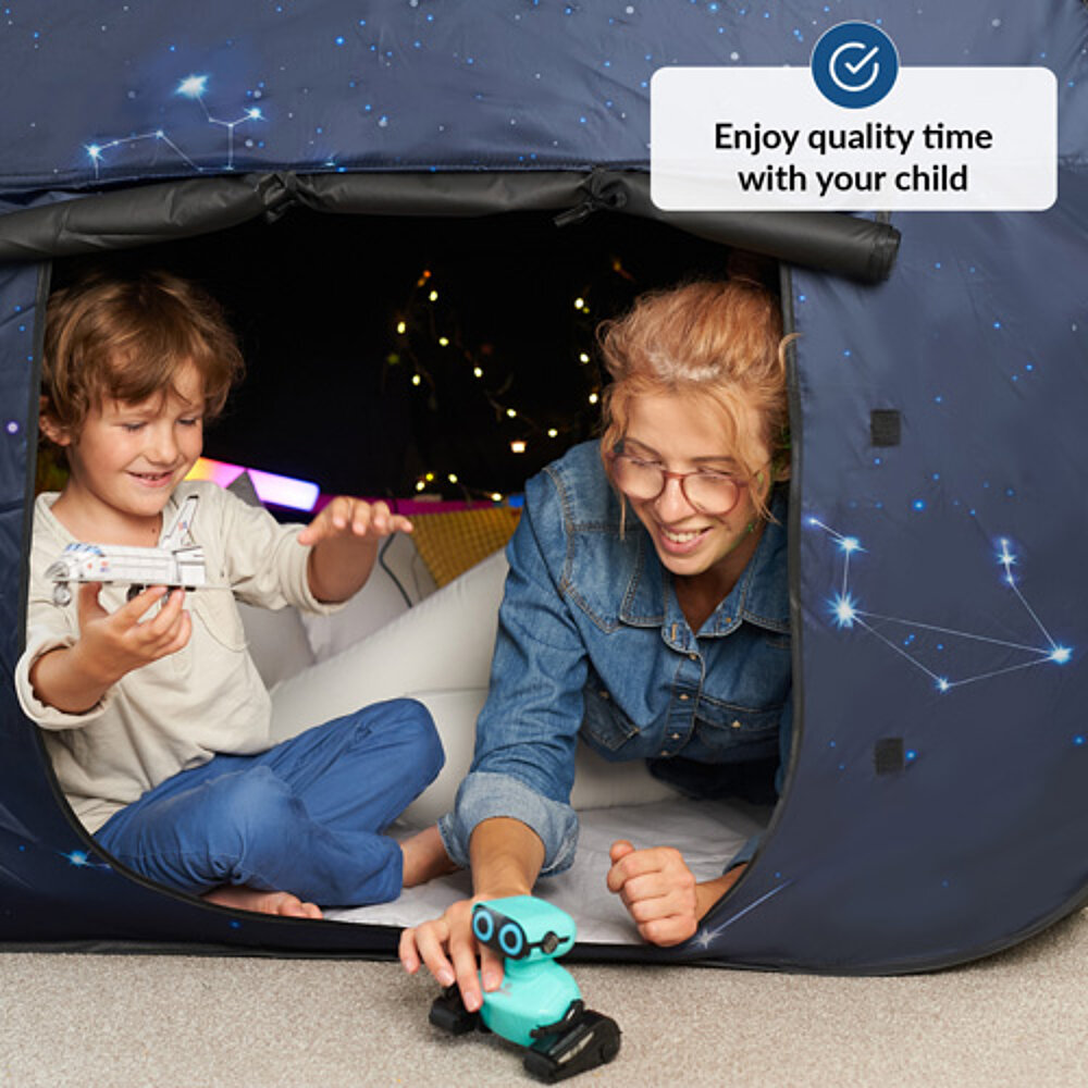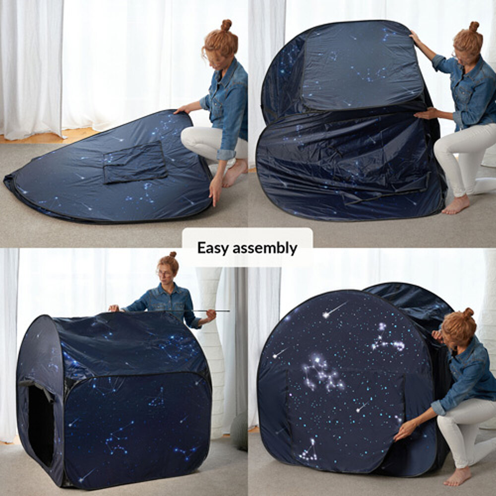 Coin sensoriel pour enfants : un espace calme dans la pièce, idéal pour jouer et se détendre. La tente offre un environnement sûr pour les enfants ayant des besoins particuliers comme le SPD, l'autisme ou des problèmes de concentration. Avec son effet d'obscurcissement, elle se prête également aux jeux de lumière et crée un espace propre pour les sens. Rapide à monter et portable, elle est parfaite à la maison ou à l'école lorsqu'il manque un lieu de retraite séparé.