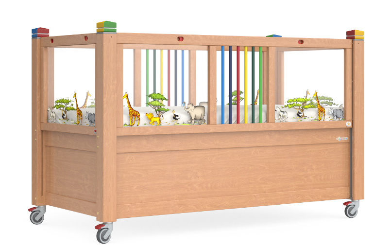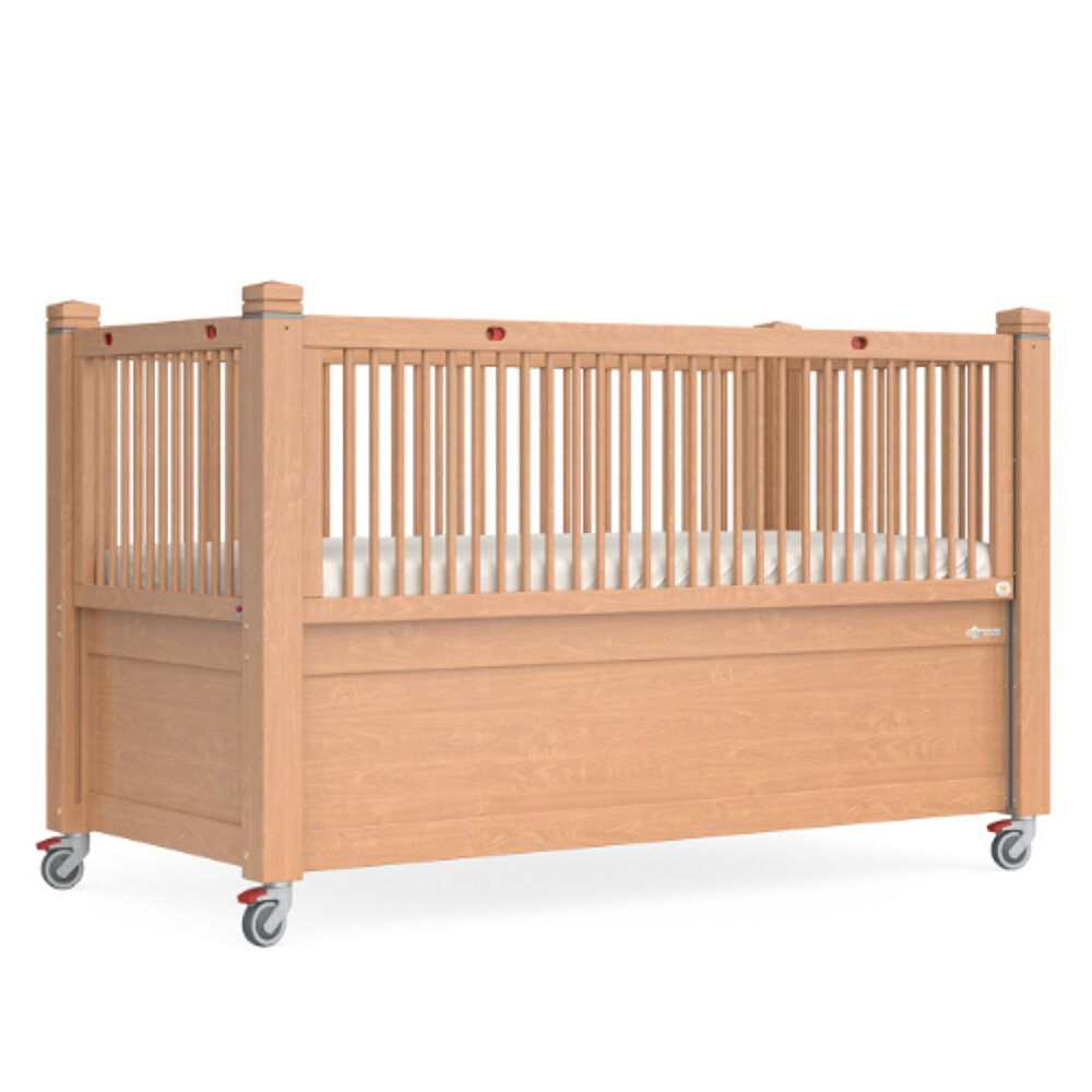 La structure de base du TIMMY 1 EasyLift correspond au modèle TIMMY 1, complétée par des barrières d'abaissement particulièrement faciles à manipuler sur un ou deux côtés longitudinaux. Le lit KayserBett est ainsi très bien adapté aux parents et aux soignants qui sont physiquement limités. Une fois déverrouillée, la grille d'abaissement peut être déplacée vers le haut ou vers le bas pratiquement sans effort. La barrière est maintenue dans chaque position par des contrepoids. Pour verrouiller la grille, il suffit de la déplacer jusqu'au point d'arrêt suivant, où elle s'enclenche. Cela est possible grâce à un système mécanique sans entretien qui se trouve dans les poteaux en bois massif.