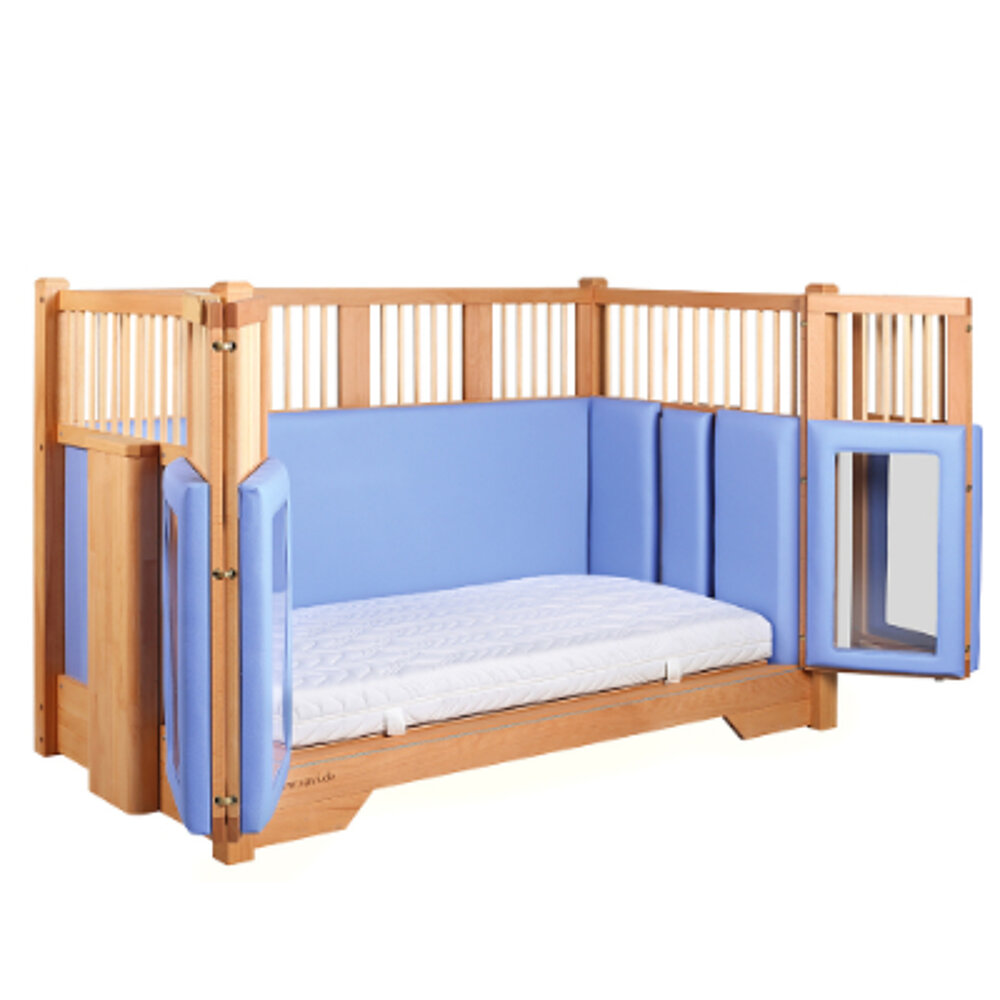 Le lit médicalisé pour enfants Tom allie fonctionnalité, sécurité et design confortable dans un concept bien pensé. Équipé d'une porte pliante et coulissante à quatre vantaux, de barrières latérales stables et de possibilités de réglage en hauteur flexibles, il offre un soutien optimal dans les soins quotidiens et dans les situations thérapeutiques.