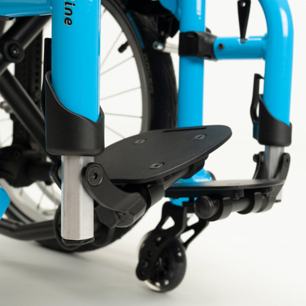 Les repose-pieds réglables et amovibles constituent une caractéristique remarquable du TRIGO T. Le fauteuil roulant permet d'ajuster le centre de gravité afin de répondre aux besoins individuels des utilisateurs. Selon le réglage, une grande partie du poids de l'utilisateur et du fauteuil peut être déplacée soit vers l'avant, soit vers l'arrière.